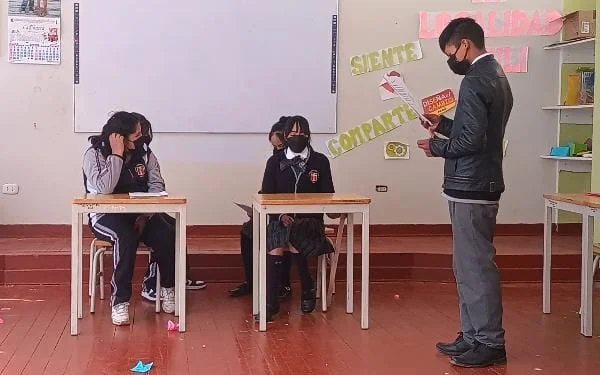 Utilizando el aprendizaje mediante el juego, Thalia y sus estudiantes de segundo grado de secundaria, realizaron la actividad “Representación teatral del derecho a la educación”, la cual permitió reforzar los conocimientos del área de Comunicación. En grupos, elaboraron un guión y escenificación teatral sobre los problemas del derecho a la educación en el Perú. Para ello, las y los estudiantes junto a Thalia, utilizaron herramientas como un reportaje titulado “La educación en zonas rurales del Perú”, el cual incentivó la reflexión y diálogo entre toda el aula.